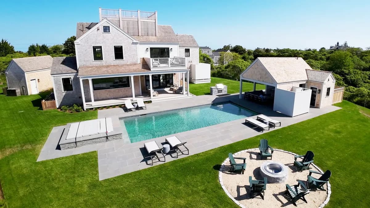 New construction with amazing views of Nantucket Sound. This move-in ready Polpis property on a 1.18 acres lot offers privacy and convenience. Located just over a mile from the Milestone Rotary, this custom 5 bedroom home boasts a first-floor primary suite, a modern open-concept kitchen, and a living room with an open space mezzanine area that affords a dramatic two-story ceiling. The outside is set up perfectly for entertaining guests, with an exceptionally large yard, an 18 x 40 pool that includes a raised spa with waterfall, a cabana that features counter seating, a kitchen area, and a covered sitting area. To finish off the outdoor living space, there is a stone fire pit and half bath and outside shower. Don't miss this rare opportunity to own in one of the island's most desirable locations! This stunning home is available for immediate occupancy and is being sold fully furnished for your convenience. Schedule your tour today!