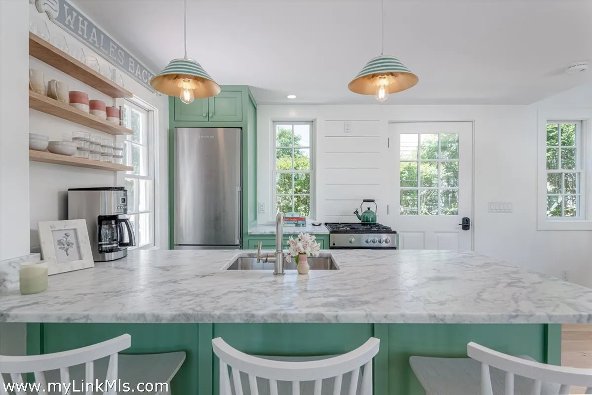Dreamy beach living in Sconset with views of the sea and a fresh aesthetic. This charming cottage has recently been fully renovated top to bottom & inside out. Celtic green kitchen brightens the mood and includes thoughtful design details including floating shelves, leathered granite countertops, Fisher & Paykel dishwasher drawer, custom cabinetry, and hardwood oak flooring throughout. The second-floor suite is spacious and cozy with a private deck perfect for relaxing after a day at the beach. Special features include nearby beach access, air conditioning, four-season living, heated bathroom floors, an enclosed outdoor shower, private parking, and established rental income. Turn-key this property is sure to impress and easy to own!