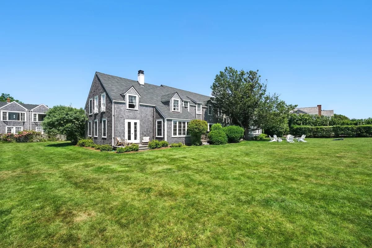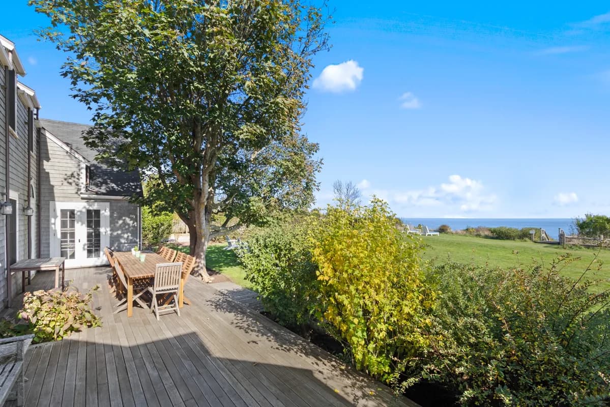 The expansive lawn stretching to the bluff’s edge, a private hedged patio with water views, and a second hedged patio has areas for a firepit, seating area, and space for lawn games. Additional amenities include two outdoor showers and direct access to the ’Sconset Bluff Walk and the beach via a Land Bank staircase.