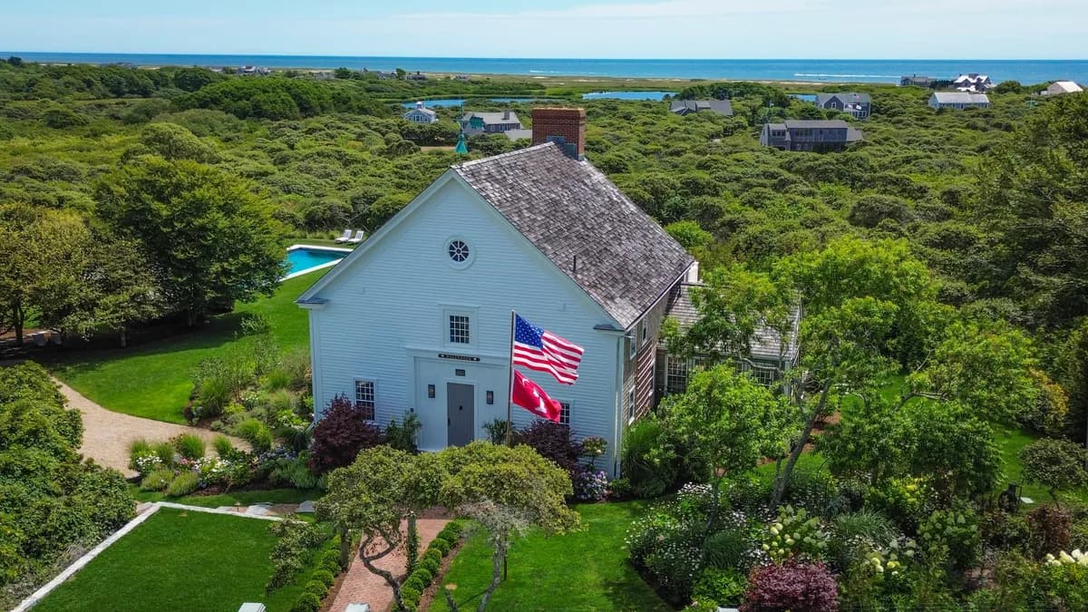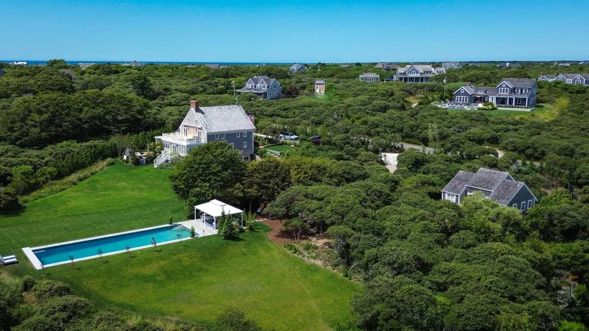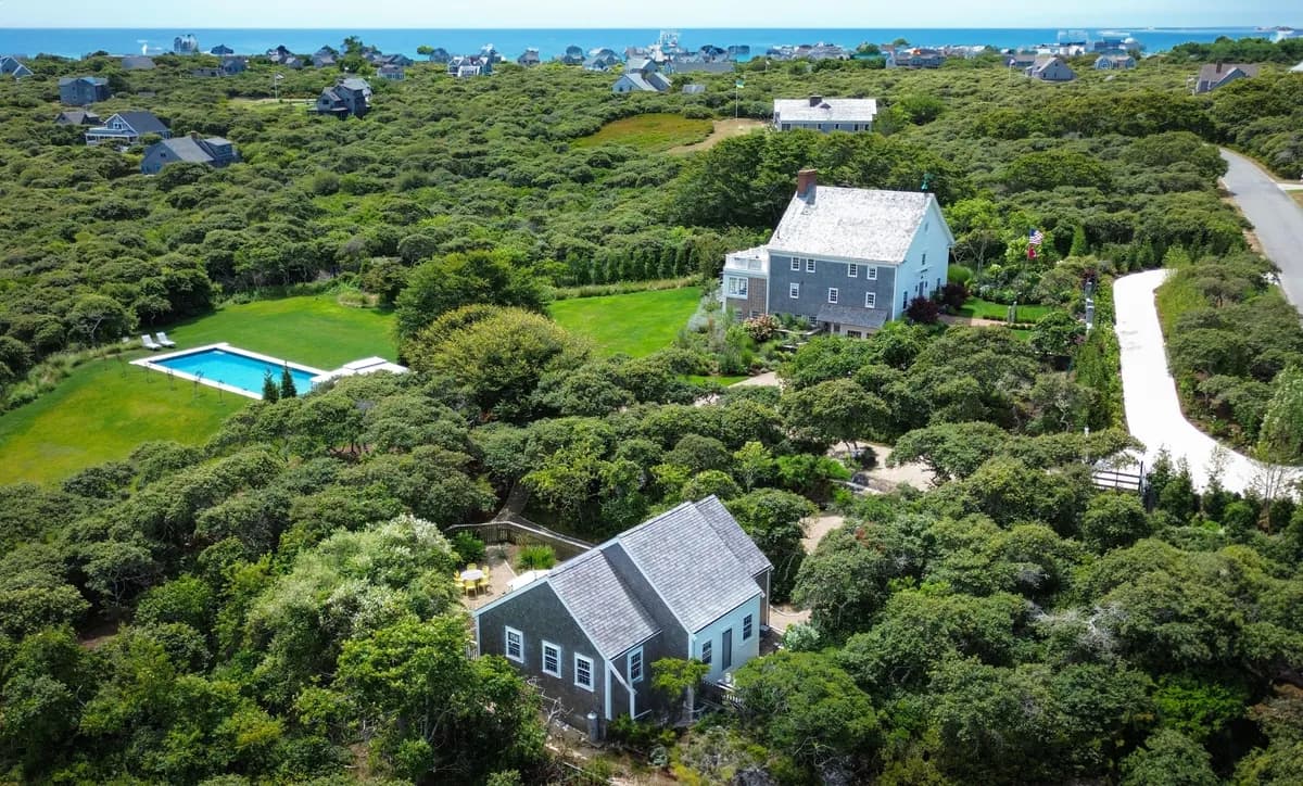 Situated in Tom Nevers East, just minutes from the Nantucket Golf Club and the village of Sconset, Hollyhock is a five-bedroom residence accompanied by a three-bedroom guest cottage, all set on three rolling acres that offer exceptional privacy, high elevations, and sweeping views from both floors of the Atlantic Ocean, conservation land, and Tom Nevers Pond. Originally constructed in Hanover, Massachusetts in 1840, the distinctive barn-style main house was relocated to Nantucket in 1979. Both the main house and cottage were thoughtfully reimagined. The current owner has an acclaimed design background and has brought the property to a new level with enhanced indoor and outdoor spaces. New bluestone patios, outdoor fireplace and dramatic gardens all within a totally fenced in perimeter. A large 60' x 20' heated saline pool with retractable cover creates a backdrop for an expansive lawn.