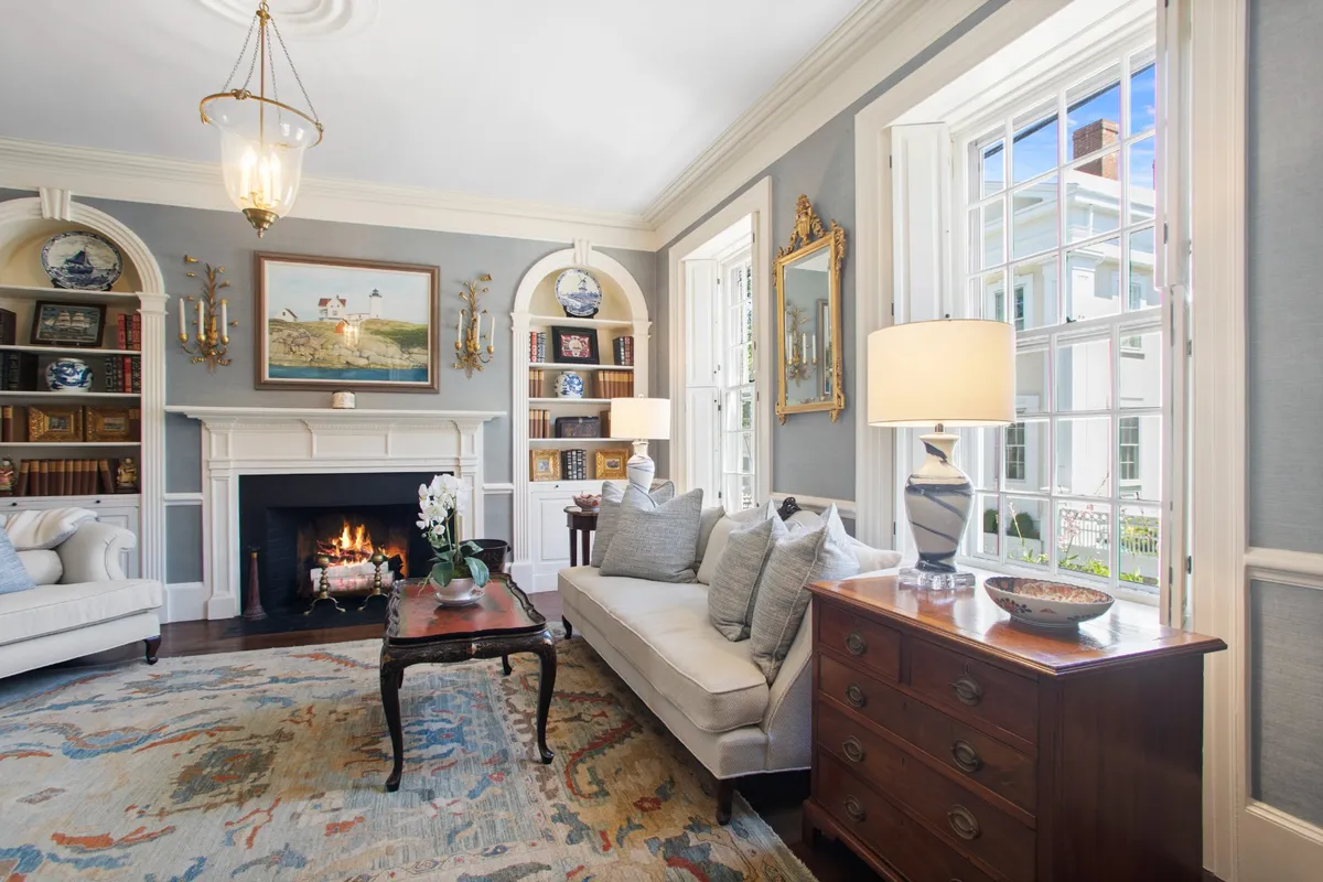 Built in 1831 by Philip Folger, 19 Orange Street is the gracious center residence in the Folger Row House Block. Exquisitely renovated to embrace its historic architecture, this sophisticated home features three levels of living space highlighted by two elegant parlors with fireplaces, formal dining room, kitchen, four bedrooms, 3.5 baths, and a small office. The magical and private courtyard garden, walled on two sides, features espaliered pear and apple trees, roses and a rose covered pergola. Original architectural details include wide pine floors, crown molding, carved fireplace mantels and arched bookcases, carved newel post, beveled glass picket doors separating the two parlors and five fireplaces. One car parking at rear of house.