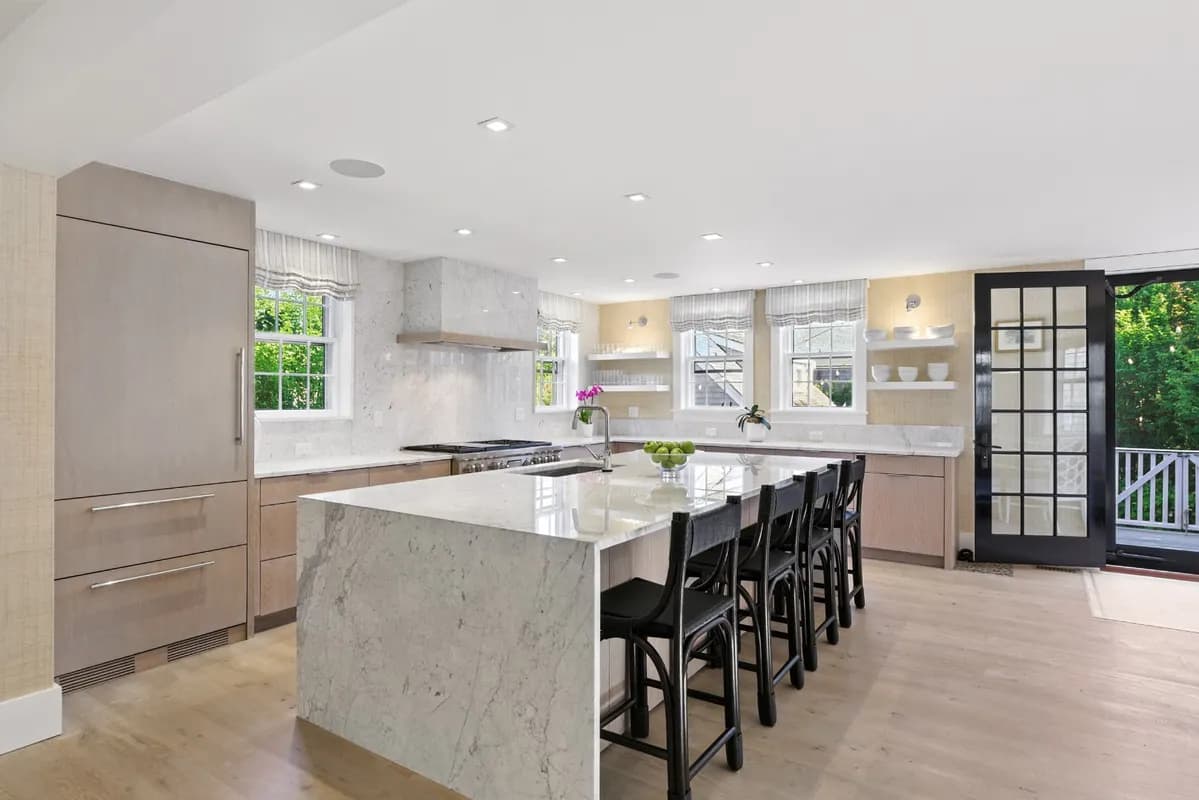 Completed in 2018, the detached studio provides additional space for entertaining and relaxation, all overlooking the private, beautifully landscaped yard. High-end finishes are found throughout both structures, including custom wire-brushed white oak flooring, integrated LED lighting, remote-controlled window treatments, and bespoke cabinetry by Faneuil Cabinetry.